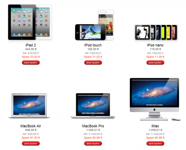 Bei Apple hingegen gibt es alles am heutigen Freitag reduziert zu haben. So kostet ein iPad2 35 Euro weniger, ein Macbook sogar 91 Euro weniger, usw. (inklusive diversem Zubehör).