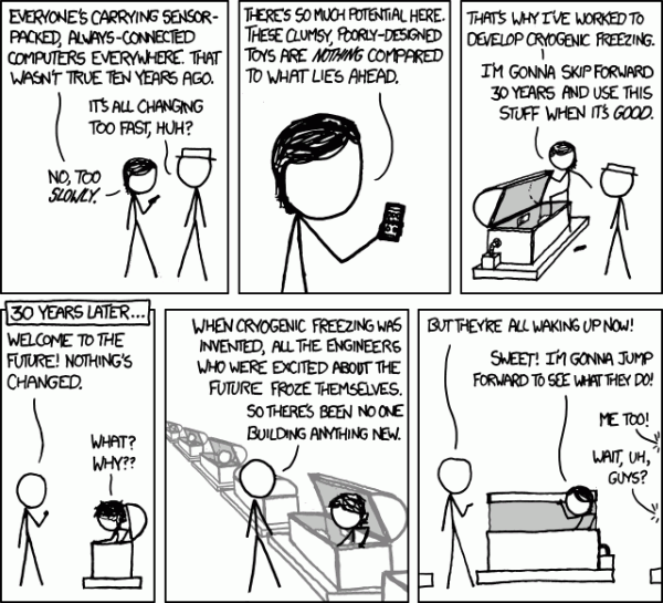 Genau so einen ähnlichen Gedanken hatte ich auch schon mal. Die wenigen Leute, die bei uns nicht „Verwalter des Reichtums“ sind, sorgen für neues und die gleichen Leute sind diejenigen, die eine Zeitreisemaschine erfinden und benutzen würden. Wenn das geschieht, gibt’s keinen Fortschritt mehr.