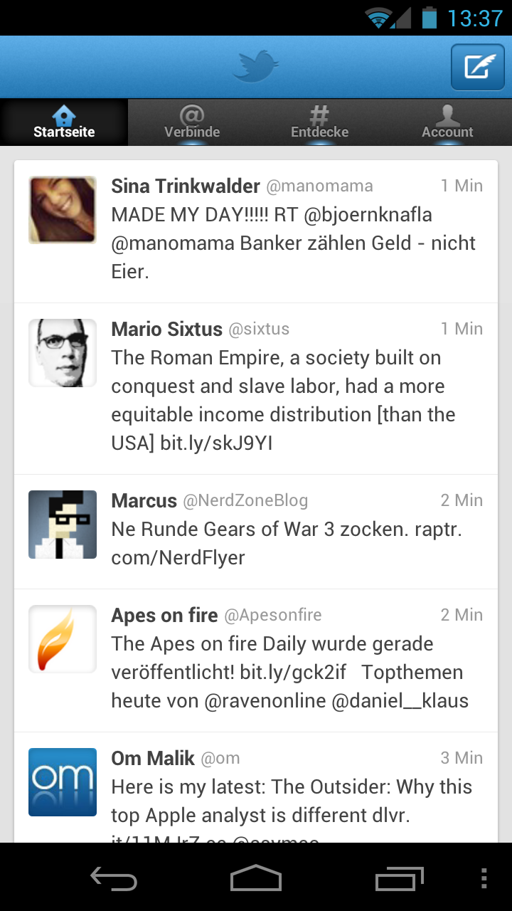 Twitter hat erst vor kurzem seine App neu gestaltet und nunja … auf dem Galaxy Nexus sind die Tabs winzig klein. Das spart zwar Platz, aber sieht nicht gewollt aus.