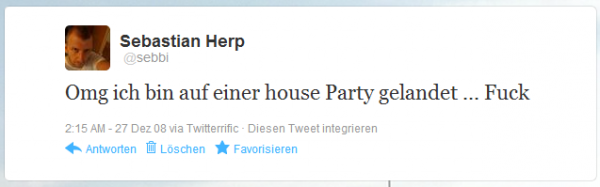 Zwischen meinem neusten Tweet und meinem ersten Tweet (oder zumindest dem ältesten noch bei Twitter gespeicherten Tweet, da dessen Datum über ein Jahr nach meinem Beitrittsdatum ist) liegen unglaubliche 1,9 mal 10^17 Tweets oder ausgeschrieben 189 777 512 784 494 044 Tweets oder fast 190 Billiarden Tweets oder 190 Millionen mal 1 Milliarde Tweets. FUCK!