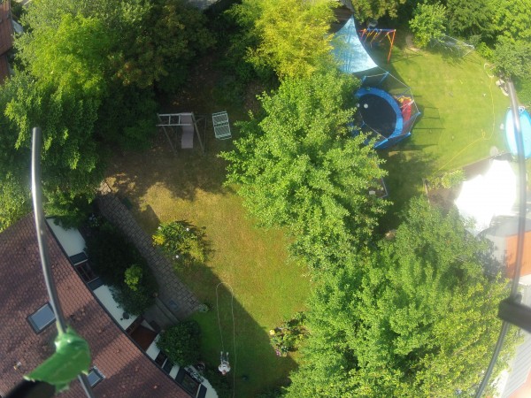 Der zweite Flug – bei dem auch das obige Bild entstanden ist – war dann mit GoPro (gleiches Akkumodell) und dauerte 10 Minuten. Gar nicht so übel, finde ich. Da habe ich mich dann auch mal getraut ein wenig höher zu fliegen … nicht leicht bei all den fiesen Landeorten in so einer „Gartenumgebung“. Später gehe ich vielleicht noch mal raus aus dem Ort und versuche die Kamera anders zu montieren. Mit der Helmhalterung klappt sie auf jeden Fall immer nach unten.