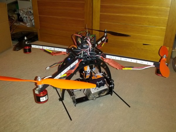 In der Zwischenzeit kam ein GPS für das Flugzeug an und der Copter hat eine Kamerahalterung bekommen, die Pitch und Roll ausgleichen kann bzw. die Kamera frei bewegen kann. Das sollte interessantere Videos geben, ist für FPV wohl aber nicht so gut geeignet, außer man fliegt im Levelmodus. Mit der kompletten Videoausrüstung und Akku wiegt der Quadrocopter jetzt 1400 Gramm statt vorher nur 1000. Das dürfte eine stark reduzierte Flugzeit zur Folge haben, ich tipp mal auf 6-7 Minuten mit einem 2200-er Akku. Blöd ist auch, dass ich noch nicht weiß wie ich diese Halterung befestigen soll. Momentan hängt sie mit Kabelbinder am Landegestell :-)