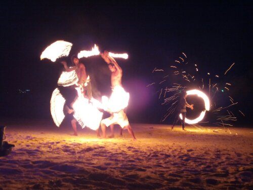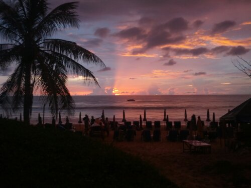 Abends ging es nach dem Essen (mit unfähiger Bedienung) nochmal kurz ins Meer und wir haben noch eine Bootstour gebucht. Am anderen Ende des Strands war Half Moon Party. Feuershows, Eimer und das Meer ist die Toilette. Der Sonnenaufgang war ein guter Abschluss.