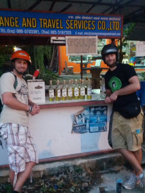 Arschensgeil! Linksverkehr und höffliches Chaos im fremden Land gepaart mit dem Beispiel der Einheimischen führt schnell zu angepasstem Fahrstil. Ziel: großer Bhudda. Oben im Bild seht ihr die „Tankstelle“ :)