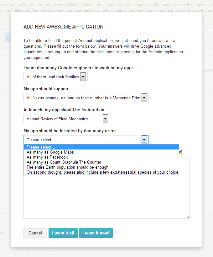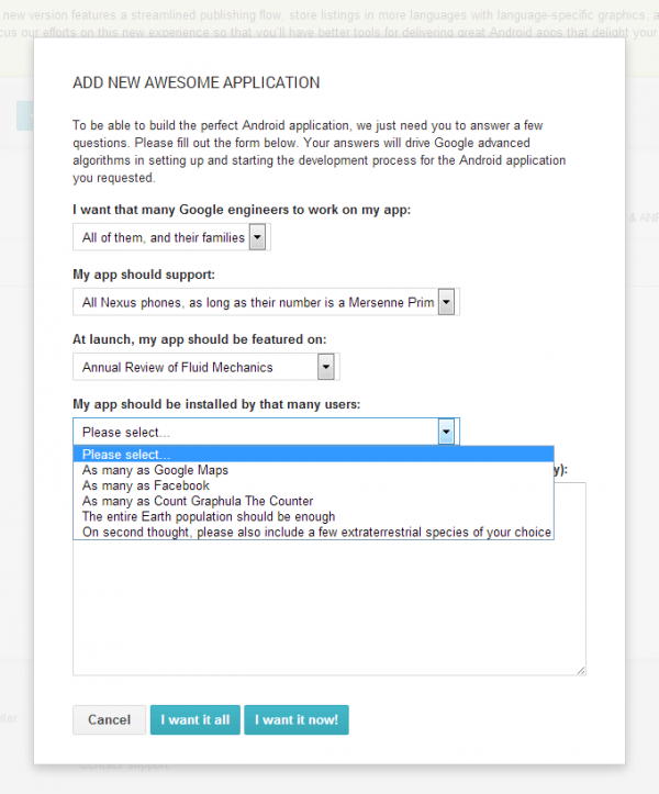 Erster April und ich habe nichts für euch. Googles Android Scherz war allerdings so witzig, dass ich ihn teilen muss. Man kann in der Entwicklerkonsole heute eine „Awesome App“ erstellen und spezifizieren wie sie aussehen soll ;-)