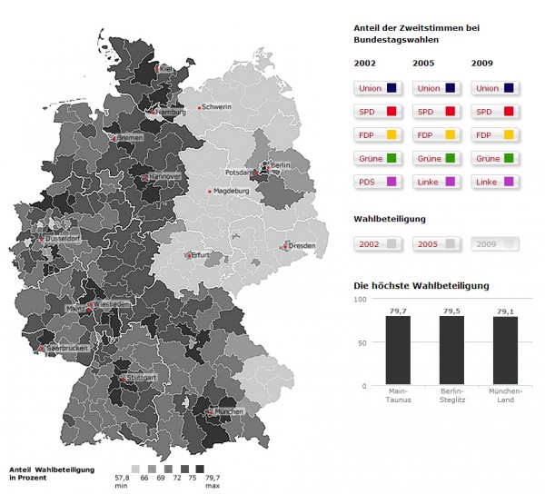 … Spiegel Online hat eine nette Übersicht zu der Verteilung von Stimmen (über Parteien) in Deutschland und auch der Wahlbeteiligung (Bild).