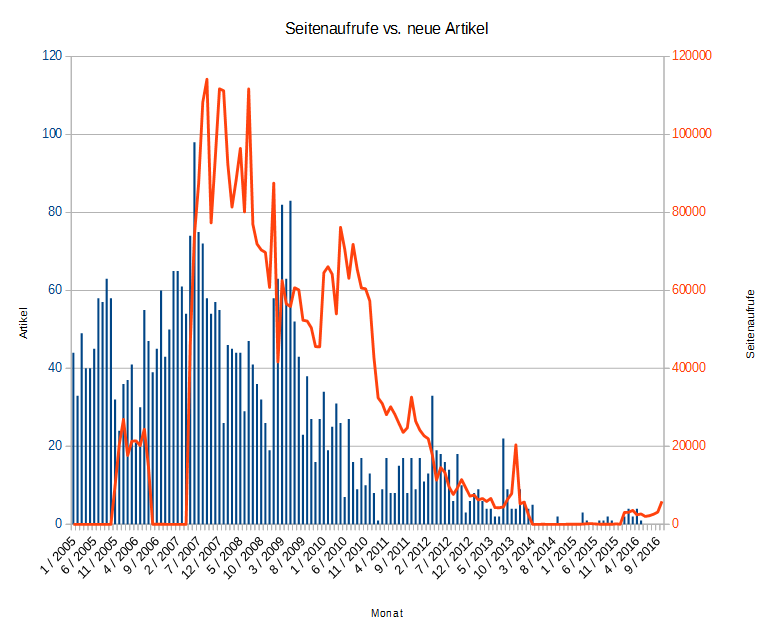 P.S.: Immerhin 5903 Seitenaufrufe im Oktober. Weit weg von den 114000 Seitenaufrufen im September 2007. Erstaunlich wie sehr die Zahl der monatlichen Seitenaurufe mit der Zahl der neuen Artikel korreliert.
