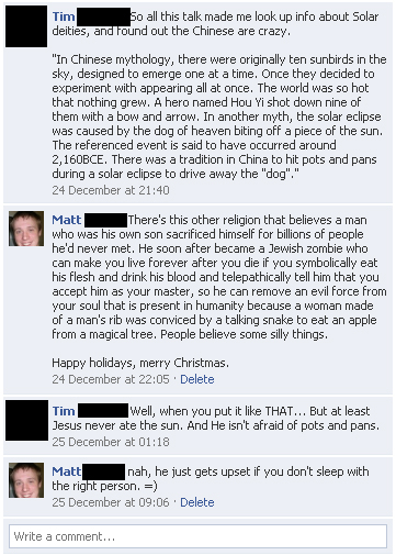 *: ich halte das Christentum übrigens mittlerweile für die fortschrittlichste Religion. Denn denen macht es scheinbar überhaupt nichts mehr aus, wenn man sich über sie lustig macht (außer ein paar verwirrten Fanatikern). Und so sollte es sein. Dafür haben sie früher aber viel Schaden angerichtet :/