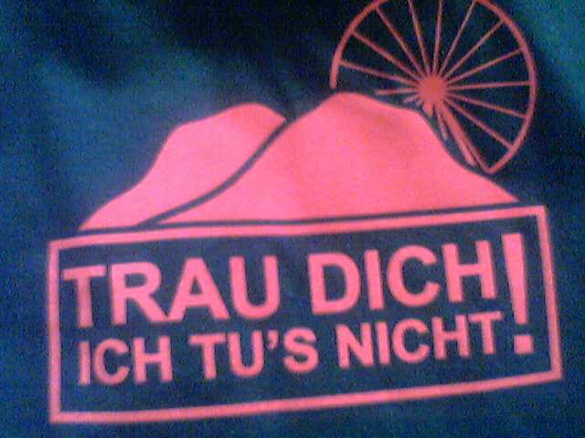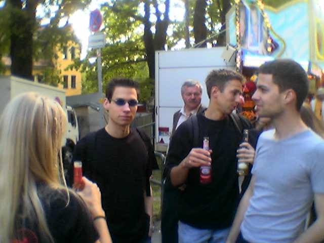 Ja und dann, oh Wunder, sprach ein nettes Mädel (Sandra?) den Frank an. Jetzt san’s scho zwei bei denen das Shirt gewirkt hat. So was! Ich hatte mir dagegen eine gar verwunderliche Begegnung mit einer Chearleader-Klassenüberspringer-Weltrekord-im-schnell-sprechen-halterin eingehandelt. Ein bischen bi schadet nie …