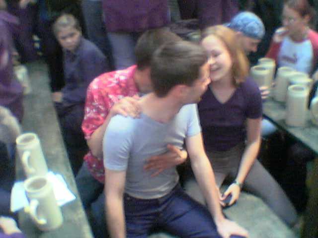 Nach zwei Maß ging es dann auch schon dem Ende des Abends auf dem Berg entgegen und es folgte der Anfang des Abends unterhalb des Berges. Eine Party bei den Corps Baruthia. Ein seltsamer Verein, muss ich dazu sagen (Zitat: „Hey dann sind wir ja beide von kaiserlichem Geschlecht, Sex?“ … ja so sind die drauf … autsch). Zunächst einmal gab es Schwierigkeiten beim Bierausschank. Es schäumte wie blöde, weil da wohl jemand zum ersten mal so was machte. So schien es jedenfalls. Wenn das mal nicht Haue von euren reichen Eltern gibt :twisted: Nach einiger Wartezeit, gutem Zureden und Ausnutzung des Blondinenspezialeffektes (Neologismus) gab es dann für 2 spezielle Gäste fünf unter größter Anstrengung zusammengeschüttete Biere. Die Firma dankt …