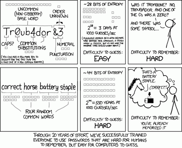 Ich weiß noch wie bei der Uni-Erlangen auch ein Passwort verlangt wurde. Das musste 8 Zeichen lang sein und mindestens 2 Zahlen und Großbuchstaben enthalten. Ich schätze in 100% der Fälle war das dann wohl das Geburtsjahr. Ein Unding! Und um auf das anfangs gezeigte Comic zurückzukommen: wenn schon Passwörter dann bitte ohne Beschränkung der Länge und der verwendeten Symbole!