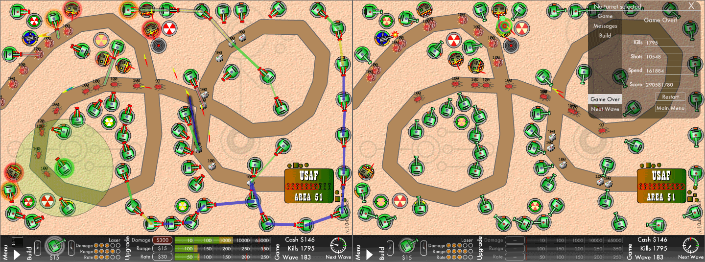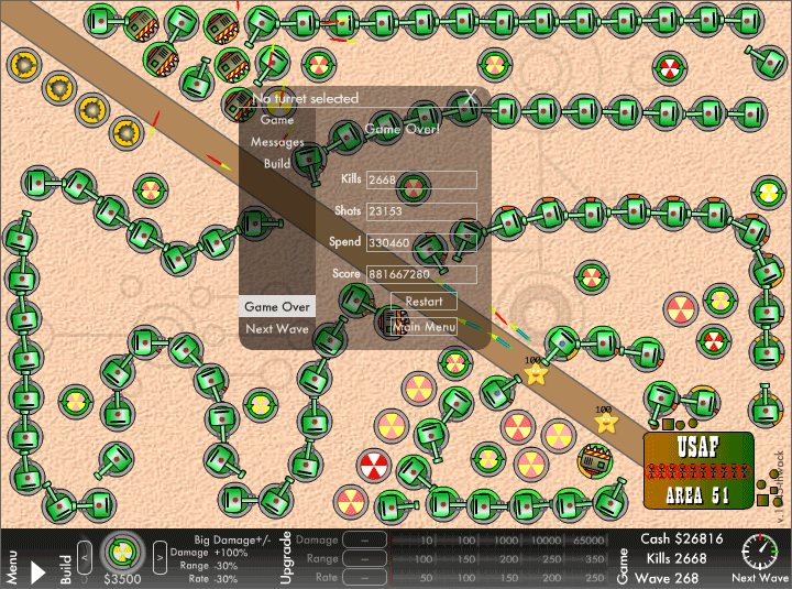 Onslaught – einer der interessanteren Desktop Tower Defense Klone … denn man kann hier die Türme kombinieren um noch stärkere Waffen zu bekommen (deshalb die grüne Schlange im Screenshot). Absolute Suchtgefahr! :twisted: