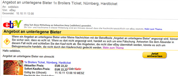 Allerdings hätte ich um ein Haar davon nichts mitbekommen, denn obwohl man ja eigentlich ständig mit Mails von Ebay bombardiert wird, kam nichts von dieser Möglichkeit in meinem Postfach an. Dort befanden sich nur zwei Mails, dass ich überboten wurde und ich nicht der Höchstbietende war. Lediglich eine Nachricht in Loginbereich von Ebay.de wies darauf hin, aber dankenswerterweise hat der Verkäufer einige Stunden später auch nochmal eine Nachricht geschrieben, die dann tatsächlich wie üblich per Mail ankam. Super vom Verkäufer, schlecht von Ebay!