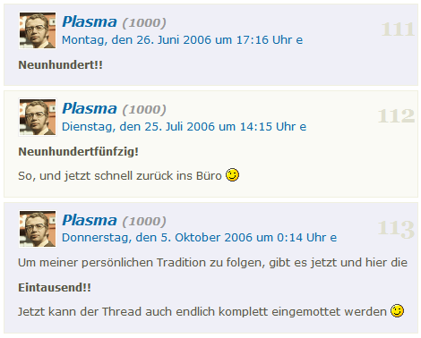 Mein 1000. Kommentar (danke für den Hinweis DirtyHarry)!!! Damit sorge ich für ein knappes Fünftel der Kommunikation in diesem Blog (5371 Kommentare gibt es insgesamt) … wow … aber man muss ja auch auf fast alles antworten, schon der Höflichkeit wegen. Meinen 1000. Artikel habe ich irgendwie nicht gesondert hervorgehoben, oder? Das hier ist jetzt der 1246. Beitrag, also dauert es noch eine Weile bis dort was zu feiern wäre. In etwa genau so lang wie es für die beiden Meisterkommentierer Plasma und Cappellmeister dauern wird ebenfalls den 1000. Kommentar zu schreiben :-)