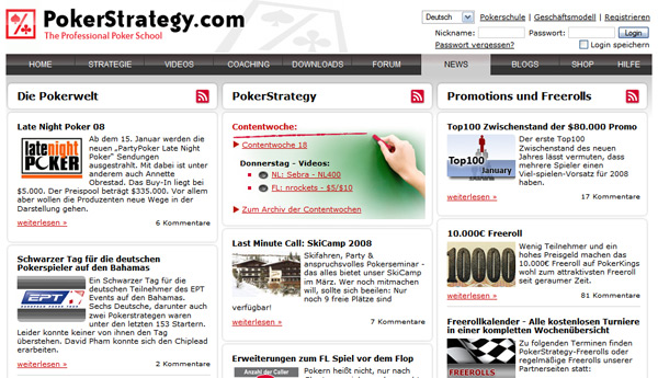 Die Seite an sich kommt übrigens ziemlich aufgeräumt herüber. Unter „Strategie“ finden sich besagte Artikel über verschiedene Strategien auf verschiedenen – freizuspielenden – Niveaus. „Videos“ beinhaltet einige kommentierte Videos mit Pokerpartien und unter „Coaching“ kann man sich auf einen Teamspeak Server einwählen und bei einem Livespiel zuschauen und auch zuhören. Wer damit immer noch nicht zurecht kommt kann im Forum in zehntausenden Beiträgen mit hunderttausenden Antworten wühlen oder einfach eine Frage stellen. Und wer kein Deutsch beherrscht, kann noch 11 weitere Sprachen auswählen, bekommt dann allerdings auch deutlich weniger Inhalt bzw. Forenbeträge geboten. Damit hat sie Seite also schon mal alles (auch ein umfrangreiches Glossar) was man für einen guten Start braucht und man merkt, dass sie sich sehr viel Mühe gegeben haben. Wow!