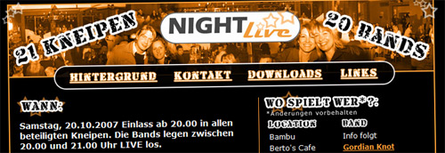 Der 20. Oktober wird ein interessanter Tag für Erlangen werden, denn an dem Tag findet nun nicht nur die Lange Nacht der Wissenschaften (von 18 – 1 Uhr) statt, sondern ab 20 Uhr auch das Erlanger Nightlive Musikfestival. Dieses mal sind ganze 21 Kneipen mit Livemusik dabei (Liste auf deren neuer Homepage), so dass die mit Wissen vollgepumpten Erlanger nach oder in der „Langen Nacht“ auch noch ein bisschen gepflegte Musik (ich wollte eigentlich Bier schreiben) mitnehmen können.