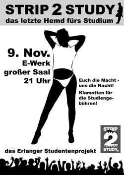 Am Freitag kommt nicht nur das Jesus Handy in den Handel, nein noch etwas viel geileres passiert in Erlangen: eine Strip2study-Party im E-Werk. Ab 21 Uhr geht es am 9. November rund :twisted:
