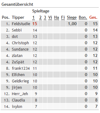 Christoph, Elfchen und Geldkrieg haben wohl vergessen ihre Tipps abzugeben. In der Liveansicht fehlen ihre nämlich …