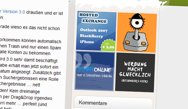 Deshalb habe ich vor einiger Zeit aufgerufen mir 125×125 von euch zuzusenden damit ich sie testweise einbauen kann. Den Test habe ich immer und immer wieder verschoben, aber wie ihr vielleicht bemerkt habt, befindet sich seit letzter Woche ein „Hosted Exchange“ Banner in meiner Seitenleiste. Mein erster Kunde ist nethosting24.de (vielen Dank) und den Rest habe ich bis Ende November mit den Meldungen von damals befüllt: Zockwork Orange (du solltest deinen Banner vielleicht nochmal überarbeiten, er ist wenig aussagekräftig *g*) und Sumit-Online.
