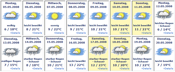 Sonntag: 17/19, 13/16, 10/11 (mittags und nachts 60% Regenrisiko)