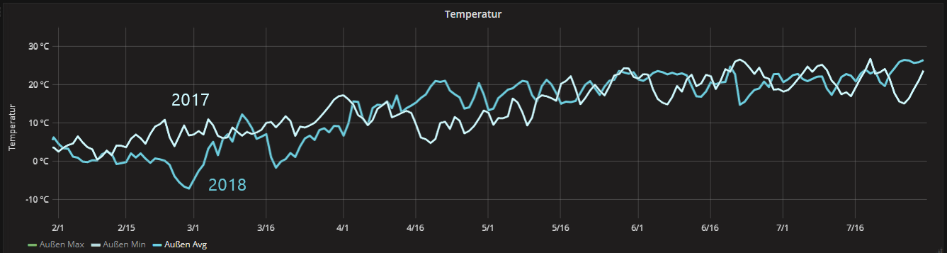 Ein kleiner Nachtrag zum letzten Artikel. Die Tagesmittelwerte von 2017 und 2018 miteinander verglichen. Der Frühling scheint letztes Jahr ein wenig milder gewesen zu sein (Ende Februar und März). Dafür haben wir dieses Jahr seit Mitte April Sommer und recht durchgehend hohe Temperaturen ohne große (kühlere) Verschnaufspausen.
